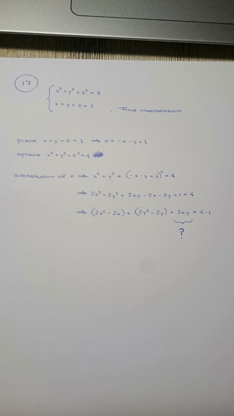 Hej! Jag ska hitta skärningsytan mellan en sfär och ett plan - den bifogade bilden är mitt försök. Jag vet inte hur jag ska vidare p.g.a. 2xy-termen i sista ledet, hade det inte varit för den hade jag såklart kunna få fram ekvationen för cirkeln (skärningsytan) m.h.a. kvadratkomplettering men nu körde jag fast. Skulle gärna vilja ha tips om hur jag går vidare, eller om hur jag borde gjort ifall jag gjort fel i något tidigare led!