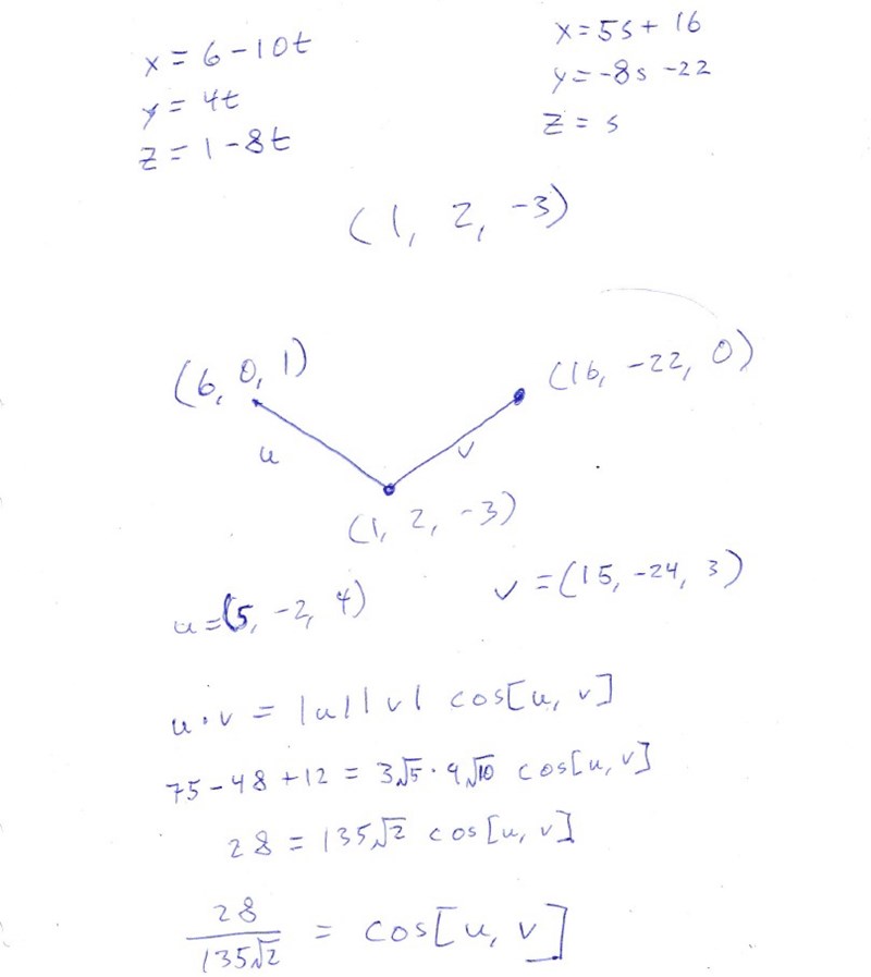 Svaret är att skärningspunkten är (1, 2, -3) och vinkeln är pi/4.