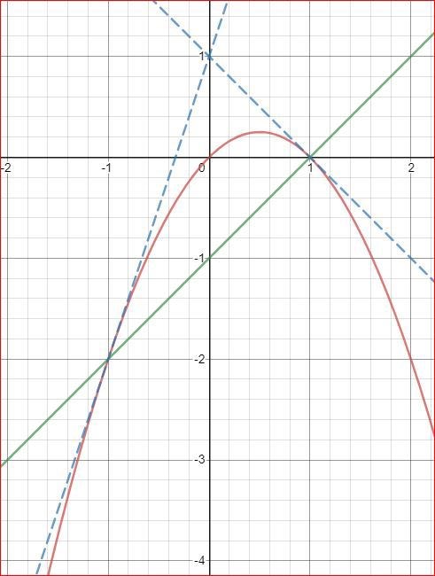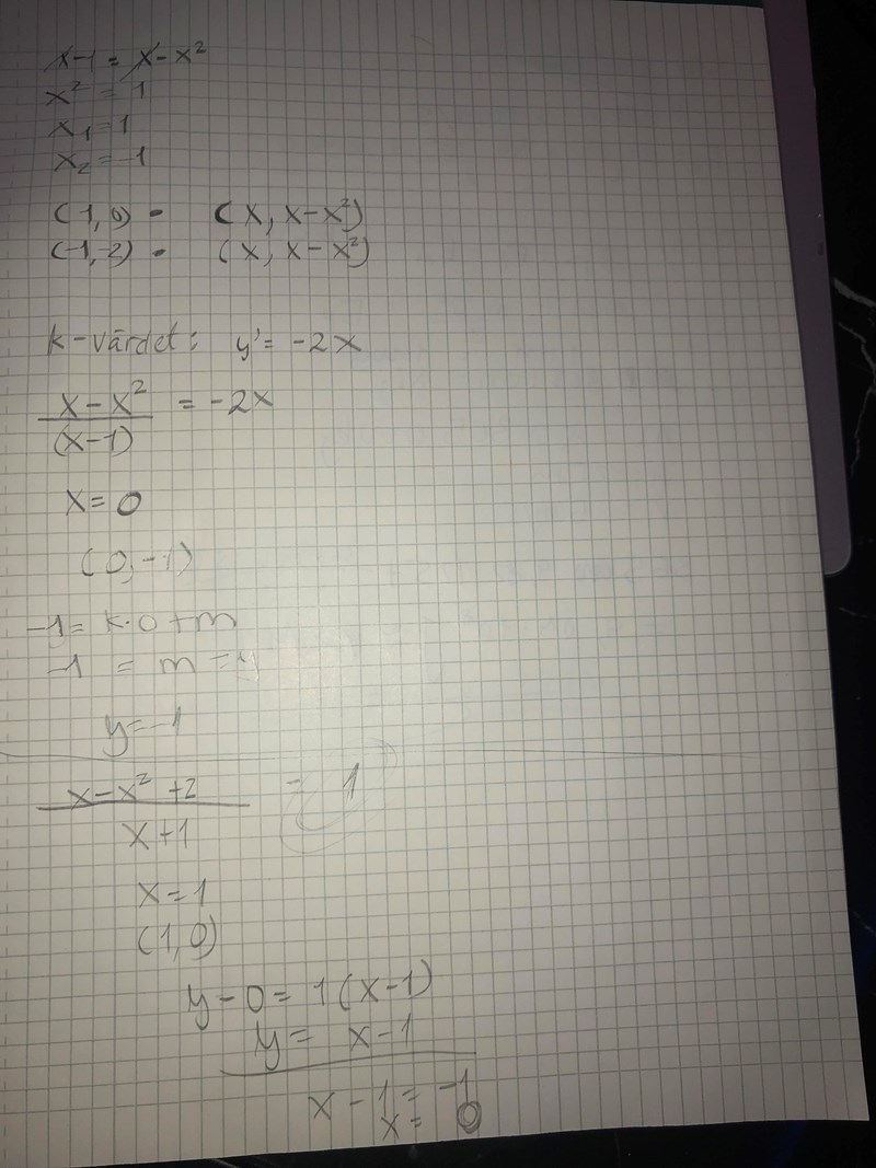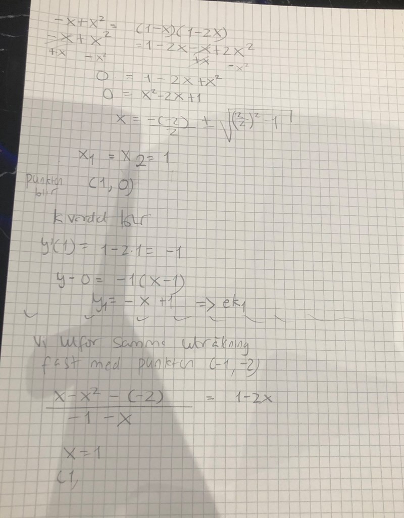 Den räta linje som tangerar parabeln i (1, 0) har därför riktningskoefficienten y'(1) = 1-2*1 = -1.