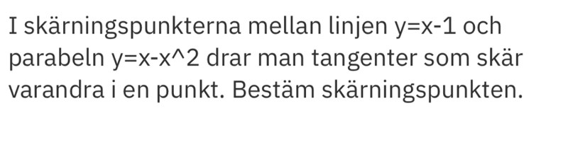 Jag har redan gjort det. Redan innan jag påbörjade min uträkning . Men fattade ändå inte vad det är jag skulle göra. Det som förvirrar mig är hur jag ska hitta de två olika ekvationena. Jag vet att det är 2 tangenters ekvationer som man måste ta reda på. Därefter ska man sätta de lika med varandra för att hitta skärningspunkten. Däremot vet jag inte hur jag ska hitta tangenternas ekvationer. Vad ska k värdet vara för varje tangent?