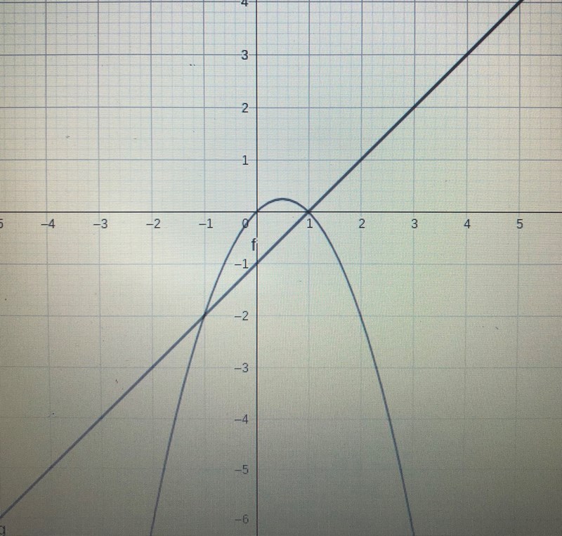 Du börjar bra genom att du hittar de två skärningspunkterna (1, 0) och (-1, -2).