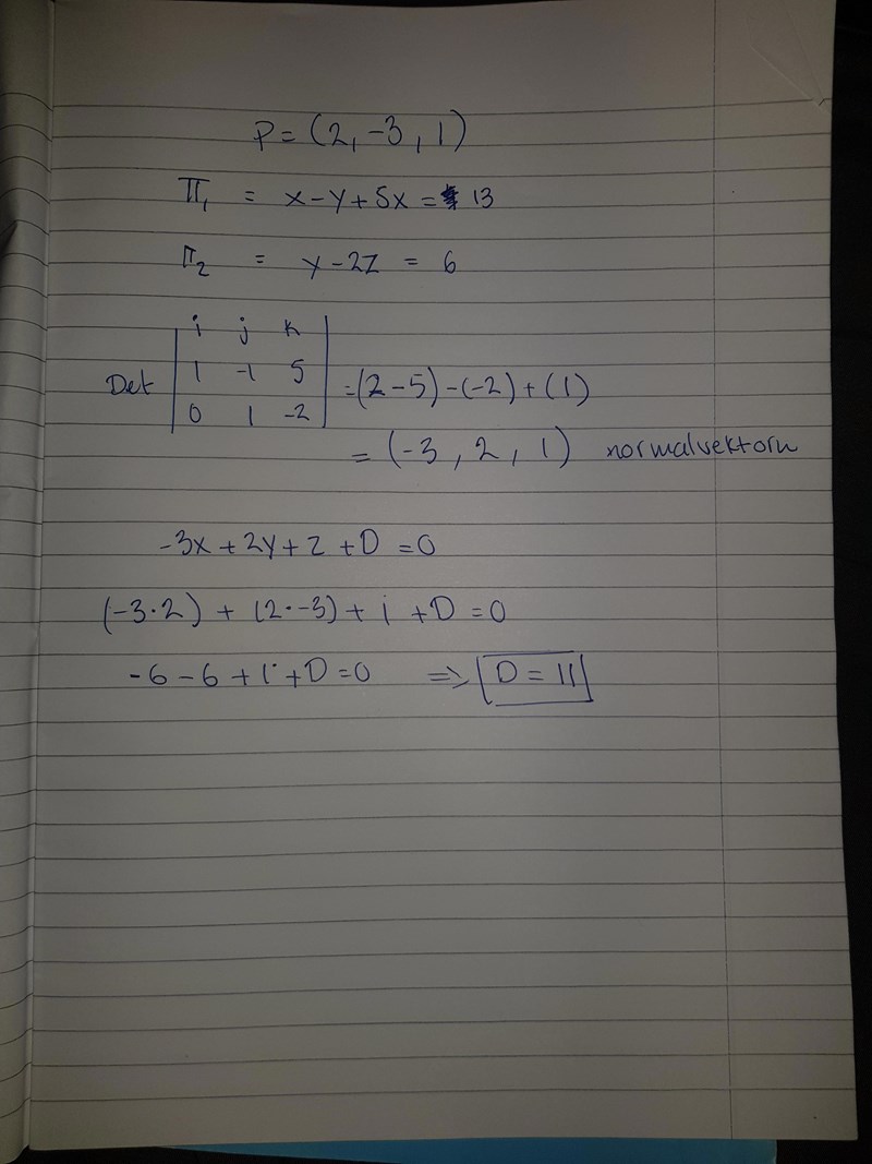 Å andra sidan tror jag att det är rätt ekvation på planet (fast du har en okänd d som borde ges av punkten P) men jag har inte kontrollräknat. Men d kanske är 11 precis som du skrivit i din fråga? (om x+d var ett skrivfel för z+d ovan). I så fall har du 3 ekvationer och 3 okända. Vet du hur du räknar ut ett sådant ekvationssystem?