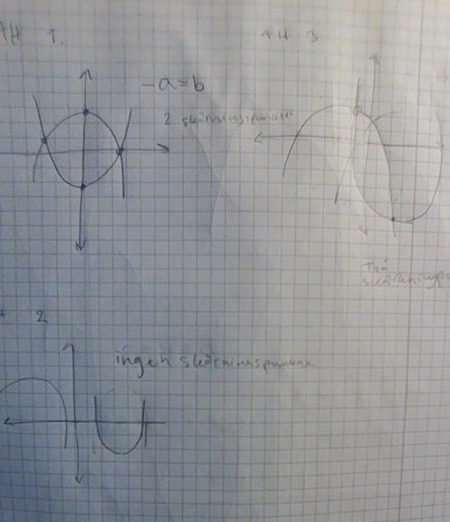 Först tänkte jag att om a och b är likamed 0 innebär det att funktionerna inte har en skärningspunkt i y axeln. Då ritade jag alternativ 2. Men det stämmer ju inte, extrempunkten ska ju vara i origo om c=0 i en andragradsfunktion(dvs ax^2+bx+c). Så hur får graferna inga skärningspunkter med y-axeln(eller inga skärningspunkter med varandra)? Eller får de alltid det då de växer i all oändlighet? Men i såfall har väll graferna alltid två skärningspunkter?