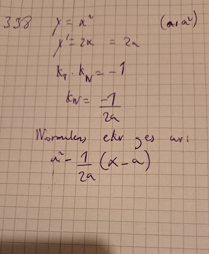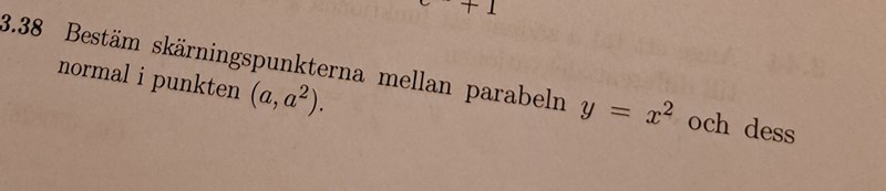 så söker du alltså de värden på x som gör att normalen och parabeln får samma värde på y, en lösning måste givetvis vara a,