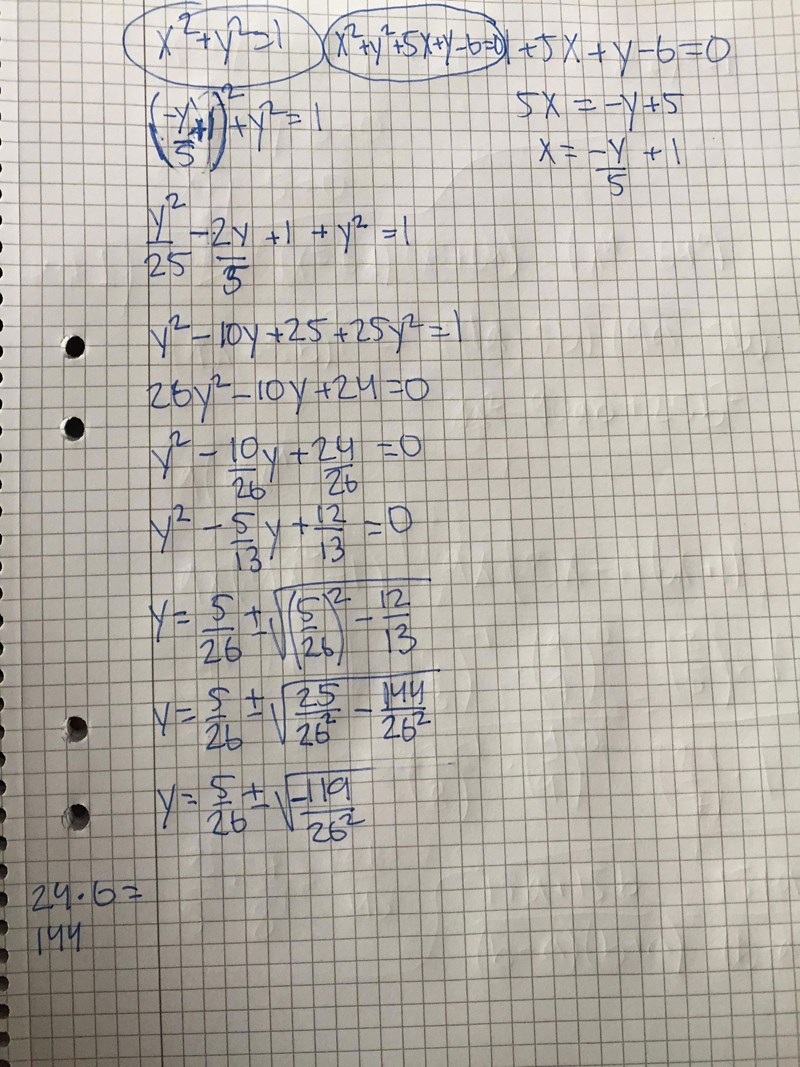 Har fått två cirklar, ringat in dem på pappret. Då sätter jag in den ena cirkeln i den andra. Räknar fram vad x blir uttryckt som y. Sätter in det i en av ekvationerna. Löser ut y till en andragradsekvation. Men vad har jag gjort fel? Fått roten ur ett negativt tal så något är fel. Det ska bli två skärningspunkter.