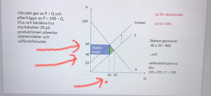 -> 20 i styckskatt tas ut för varje q och det säljs 40st q (där "D" och "S+skatt" skär varandra) - därav är skatten: (60-40)*40=20*40=800