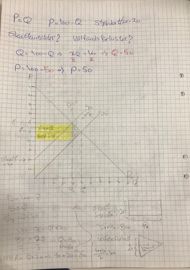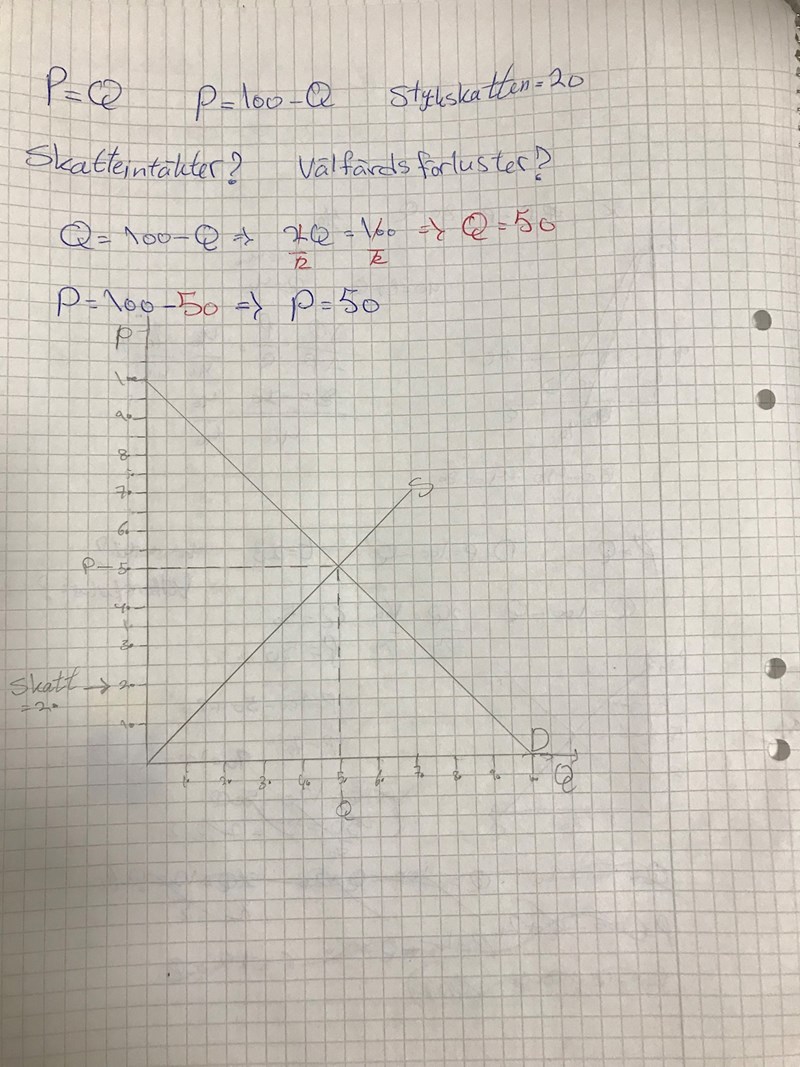 Tusen tack för svaret. Jag vet att Tax=20=M men jag vet inte var kommer 40 och 60 på Y-axlen och 40 på x-axlen. Jag kunde bara hitta jämvikt punkten som är 50&50 men om kommer 20 skatt till hur myket skiftar utbudskurva? därför jag kunde inte hur fortsätta rita andra utbuds kurvan som börjar från 20. Om min lösningen är rätt på pappret hur kan jag forstsätta?