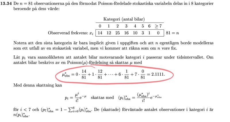 Skaft skrev:Det är medelvärdet som beräknas i 13.34 också. Så totalt antal bilar, delat på totalt antal dagar. 12 gånger sågs en bil, så den kategorin bidrar med 12 bilar. 25 gånger sågs 2 bilar, så det blir 25*2 =50 bilar, osv. Sen delas varje term med 81 istället för att ställa allt på samma bråkstreck, men det gör ingen skillnad.
