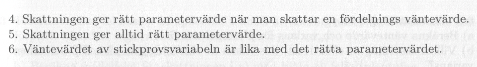 4. Skattningen ger rätt parametervärde när man skattar en fördelnings medelvärde.