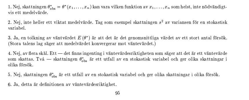 För en stickprovsvariabel kan vi välja vilken funktion som helst. Vi vill ju att det ska vara en funktion som ger en någorlunda bra skattning av , men det behöver inte rimligtvis vara det (så tolkar jag vad en skattning är). Att en skattning ger rätt parametervärde vid ett stort antal försök betyder att skattningen är väntesvärdesriktig - dess stickprovsvariabel har . Men eftersom alla skattningar inte är väntevärdesriktiga, så är (3) och (6) bara sanna om skattningarna är väntevärdesriktiga.