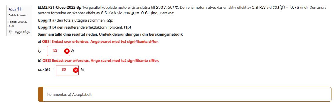 Beräkna a) Den totala uttagna strömmen (I1=(3.9*10^3)/(230*0.76) vilket är ungefär 22.3A och I2=(6.6*10^3)/230 är ungefär 28.7 A —> tillsammans blir det I=22.3+28.7=51A - Inga problem att räkna ut, men nu ska jag få fram den resulterande effektfaktorn och jag fattar inte hur jag får fram det - frågar jag chatGTP så blir det ca 58% vilket inte stämmer med facit. (Finns bara ett svar - inget hur man gör uträkningen, tyvärr - men man ska få fram att det är 68% (ca?).)