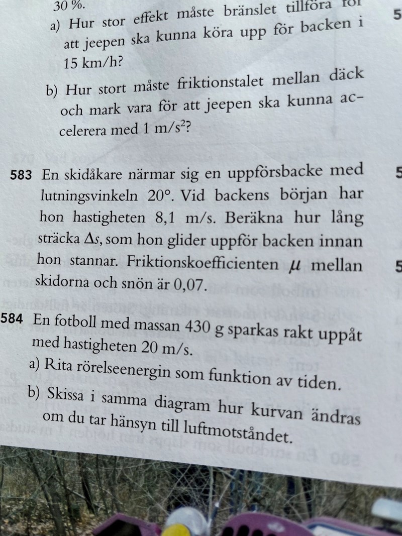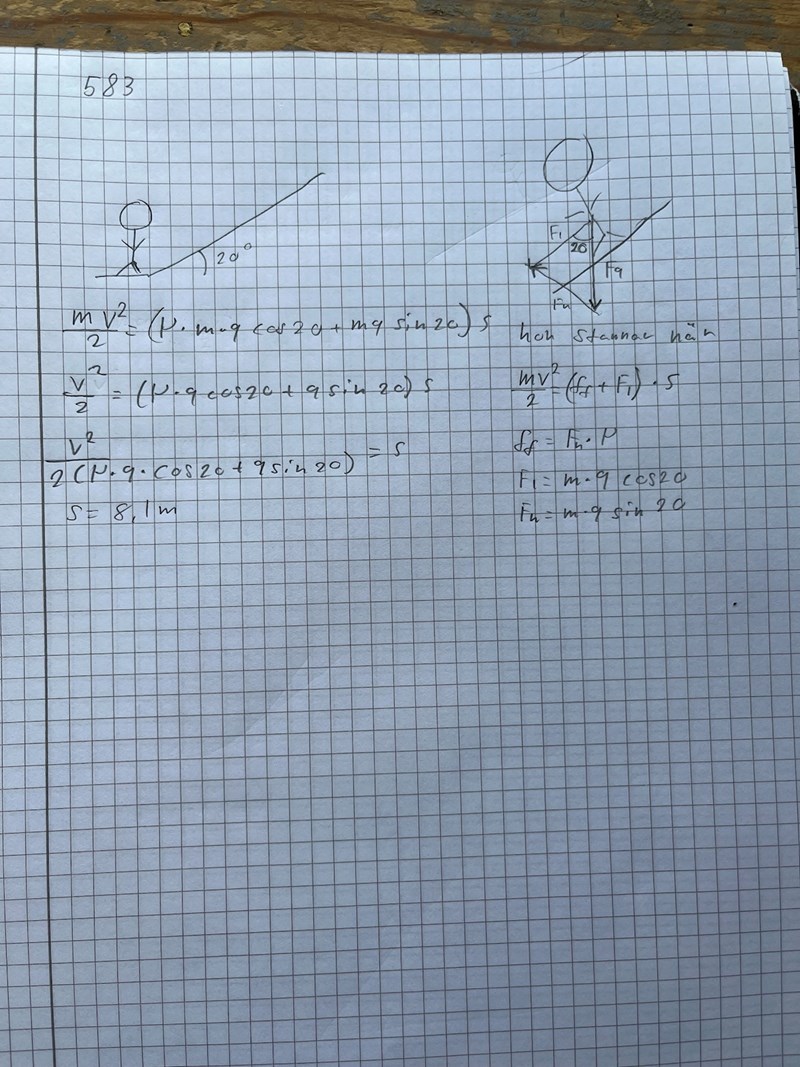 Lite definition på höger sida och uträkning på vänster. Jag löste uppgiften efter ett tag men hade svårt att förstå att arbetet som drog ner skidåkaren var (Ff + f1)*s =(mv^2)/2