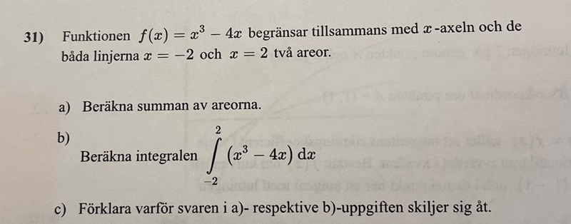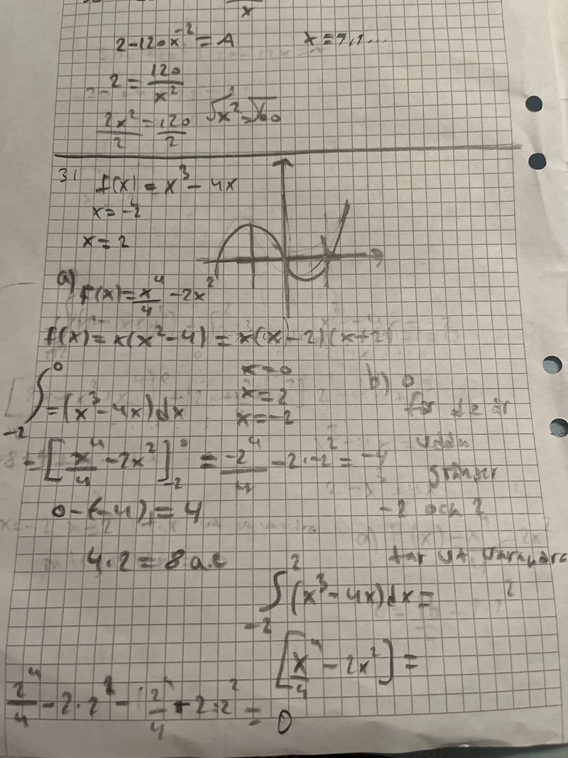 på a) är frågan arean så det kan bli ett svar, jag vet inte om detta är rätt uträknat för tänkte om jag räknar ut arean på den ena sen dubbla men ”chat GBT” förklarade på något jätte konstigt sätt då man ska ta båda integralerna minus varandra men måste byta tecken