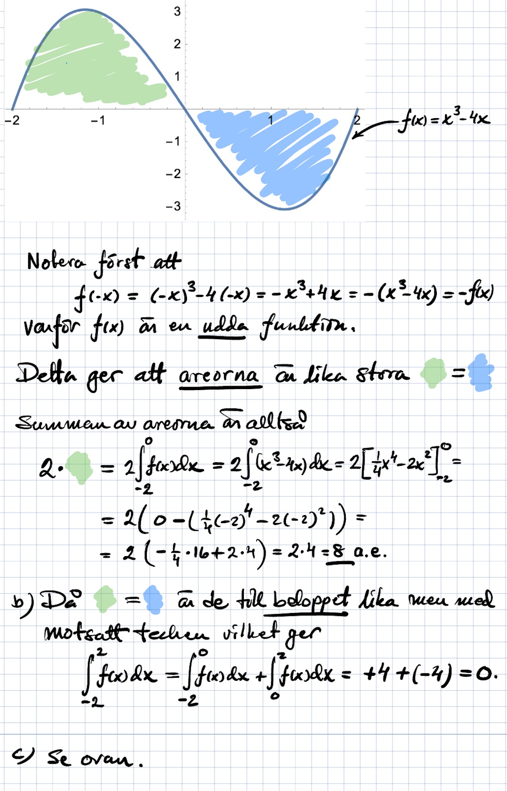 jag förstår inte vad -f(x) gör för att visa areorna är lika stora eller den visar som du har skrivit att de är udda, därför tar de ut varandra, är det så du menar?