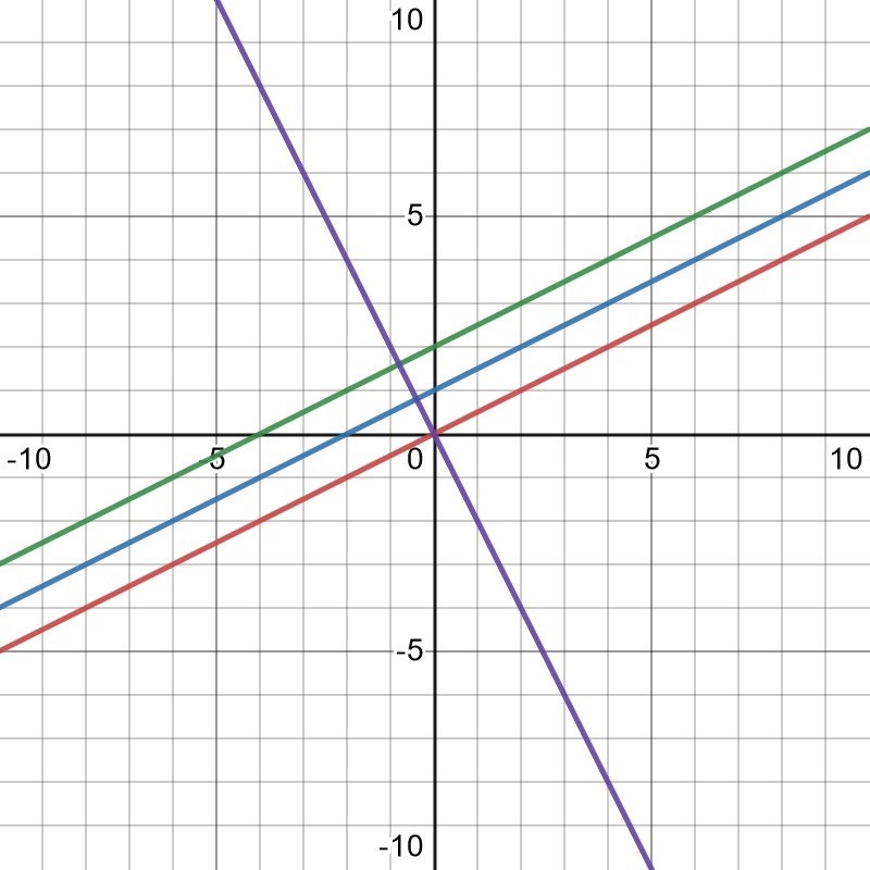 Om två linjer är vinkelräta så gäller det att produkten av deras riktningskoefficienter är -1, d v s k1k2 = -1 och riktningskoefficienterna är k1 respektive k2. De röda, blå och gröna linjerna har riktningskoeficienten 0,5 och är parallella med varandra. Den lila linjen har riktningskoefficienten -2 och är vinkelrät mot de tre andra.