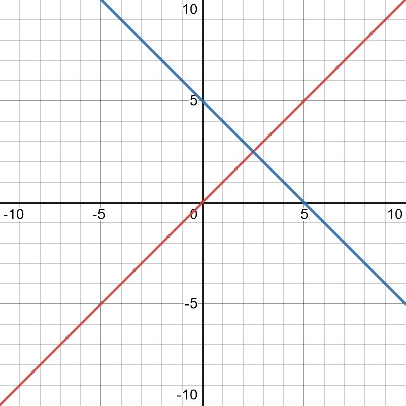 Jaha, så linjerna är vid det fallet parallella linjer. Men på y = x och k = 10 - x då, hur får man reda på att riktningskoefficienten är -1?