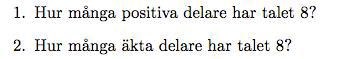 Smaragdalena skrev :Var hittar du dina uppgifter? Det måste finnas en definition av "delare" och "äkta delare" straxinnan de här frågorna. "Äkta delare" är något jag behöver slå upp innan jag är säker på vad det betyder, men jag gissar att 1,2,3 och 6 är delare till 6, men att endast 1, 2 och 3 är äkta delare. Alltså skulle svaret vara 1,2,4,och 8 på 1, och 1,2 och 4 på 2.