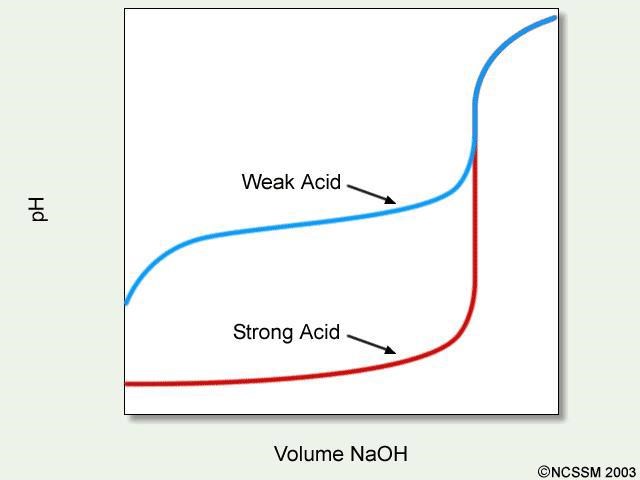 Det är ingen konst i en lösning av en svag syra. Det finns ju väldigt få vätejoner från början så du behöver bara ta bort ett fåtal för att koncentrationen ska minska ganska snabbt. I en lösning av en stark syra är koncentrationen lika hög som syrans totala koncentration. Då måste man tillsätta väldigt mycket av basen för att se en effekt på pH.