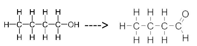 vätet från OH-gruppen binder till ett väte från kolatomen OH-gruppen binder till. Så det blir en vattenmolekyl + butanal. Men asså det är väl samma sak som vid oxidation. Jag fattar inte vad skillnaden är... För det är ju samma vid oxidation, dvs att OH-gruppen går över till att bli en aldehydgrupp.