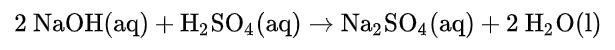 2 NaOH(aq) + H2SO4(aq) => Na2SO4(aq) + 2 H2O(l)