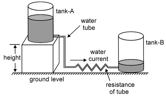 Elektrisk spänning är då att jämföra med höjd eller med tryck. Det är det som driver vattenflödet (strömmen). Även orden "potential" och "potentiell energi" passar den analogin.