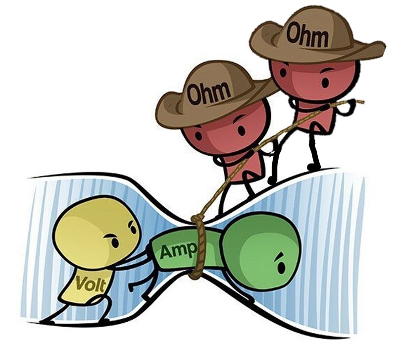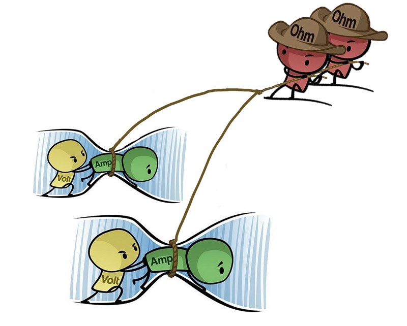 Denna bild förklarar även sambandet mellan de tre, . Om spänningen är väldigt hög, ja då kommer det antingen passera mycket ström genom kretsen, eller så måste motståndet vara väldigt stort. På samma sätt kan man se på strömstyrkan – om den är väldigt låg, då är det antingen motståndet som är högt eller spänningen som är låg.