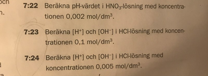 andra uppgiften går ut på att beräkna [H+] och [OH-] i HCl lösning med koncentrationen 0.005 mol/dm3
