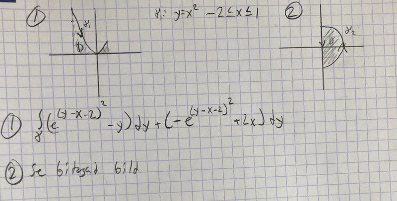 För 1) kan jag använda greens formel om jag sluter området till markerat område. Efter jag slutit området använder jag greens och beräknar och får ut rätt svar.