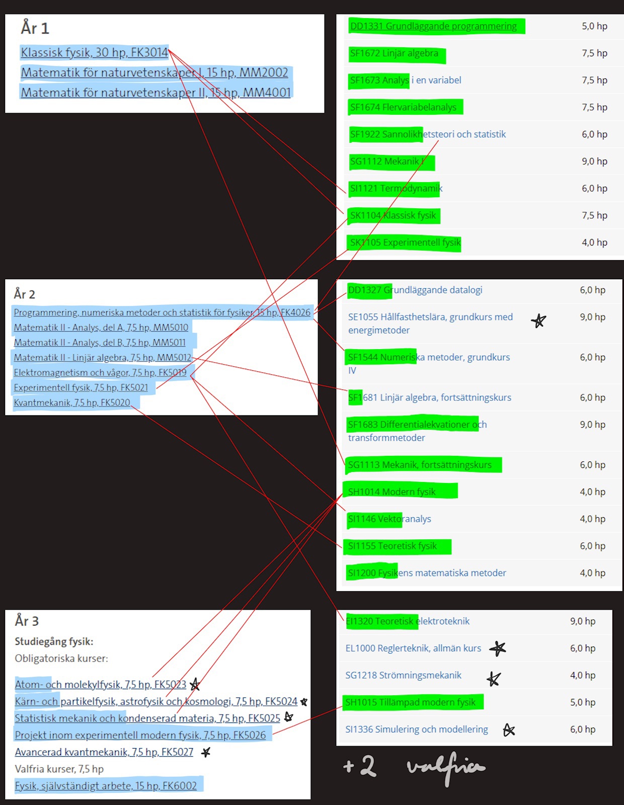 Blått är de kurser som tf täcker hos fysik och grönt är vad fysik täcker på tf. De som bara är ifyllda delvis betyder att de bara täcks delvis, och proptionellt mot hur mycket som täcks. Summan hp i fysik respektive tf som INTE täcks av det andra programmet uppgår i 57,5hp respektive 25,5hp. Röda streck är innehållsmässig koppling, jag har undvikit mattekurserna, se varför nedan. Stjärna markerar kurser som är flaggskeppen för respektive program.