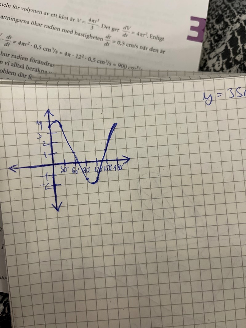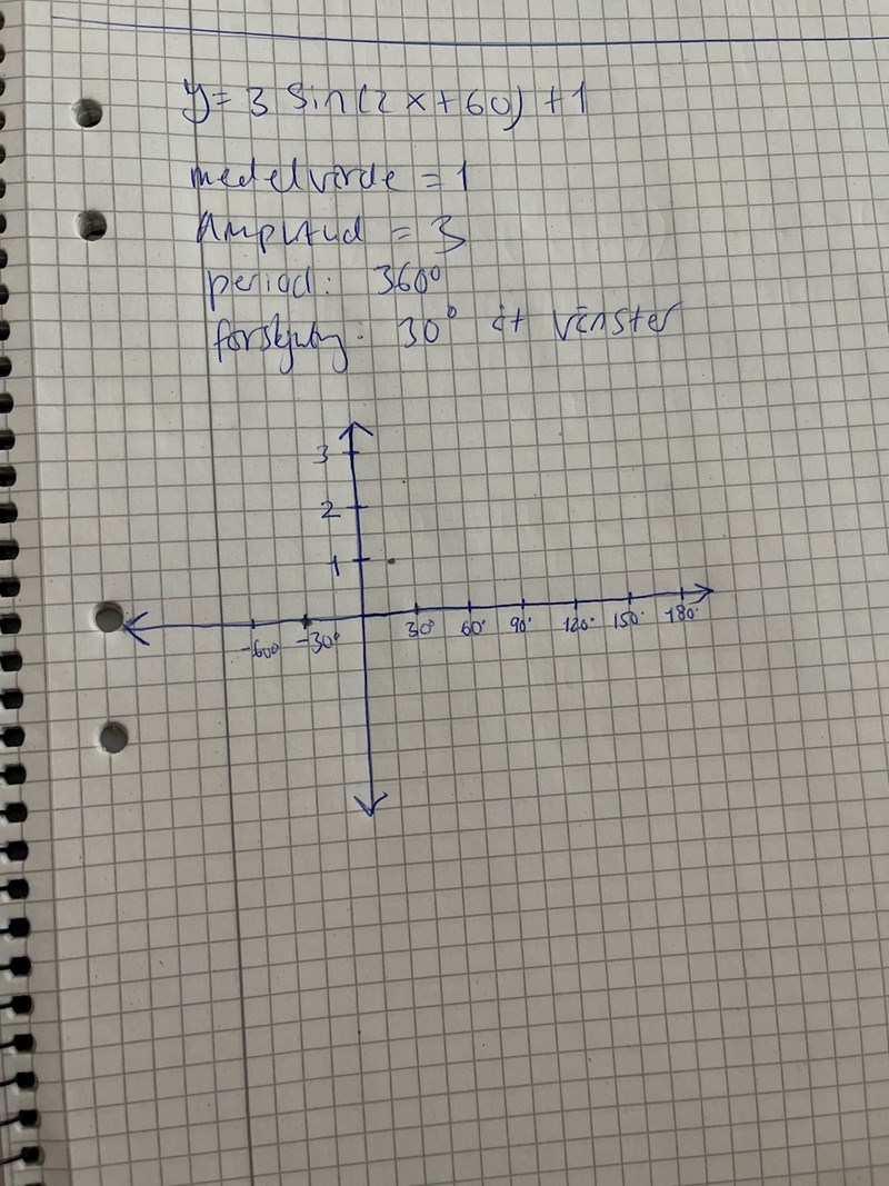 Skissa grafen till funktionen y= 3 sin (2x+60) + 1 på rutat papper utan miniräknare och rita sedan grafen med räknare som kontroll.