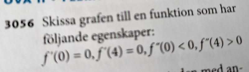Det står att du ska skissa grafen till en funktion som uppfyller dom olika egenskaperna. Säg att facit har ritat grafen till funktionen , då gäller exempelvis att grafen till funktionen är ett till exempel på en sådan funktion (där är en konstant).