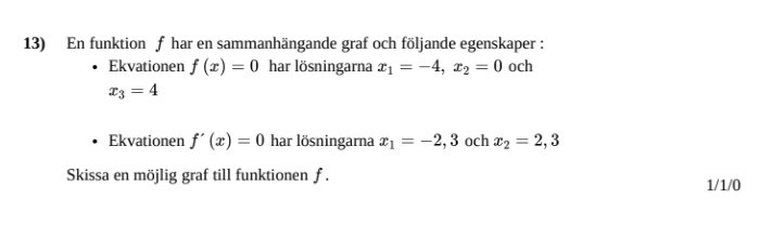 Ta det steg för steg. Den första information berättar var funktionen skär x-axeln. Markera dessa helt enkelt med punkter. Information två ger dig var det finns extrempunkter. Lite skumma värden dock om jag tolkar det rätt. -2,3 känns lite random, men testa!