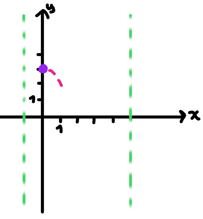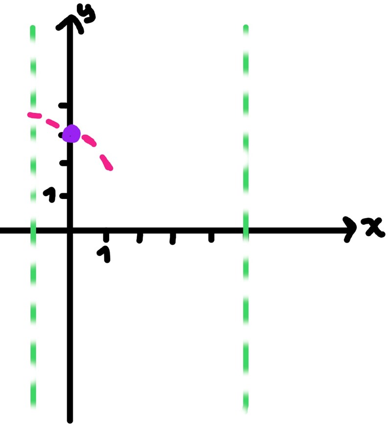 Någonstans på de gröna linjerna ska det ligga extremvärden/terasspunkter. I grafen kan vi läsa av att derivatan är negativ då x är noll. Det innebär att funktionen f(x) måste avta i värde för små, positiva värden på x. Detta kan vi rita in: