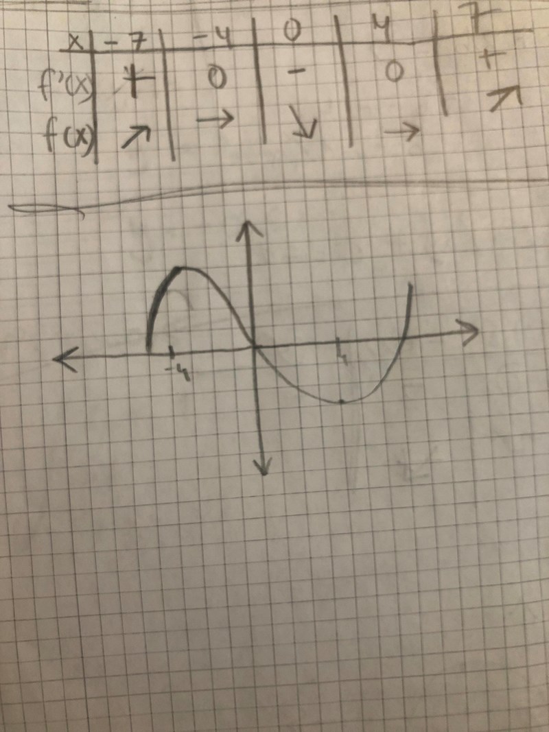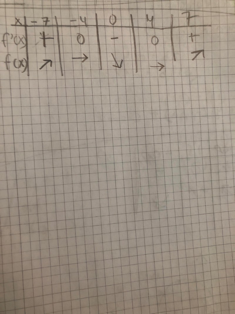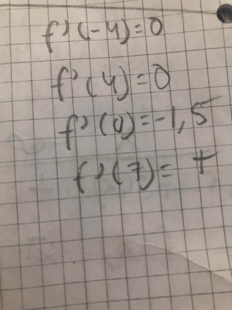 Vi vet att f’(x) = c(x-4)(x+4) och att f’(0) = -1,5. Vilket ger att c = 3/32, så att f’(x) = . Du kan tex använda den formeln för att göra värdetabell.
