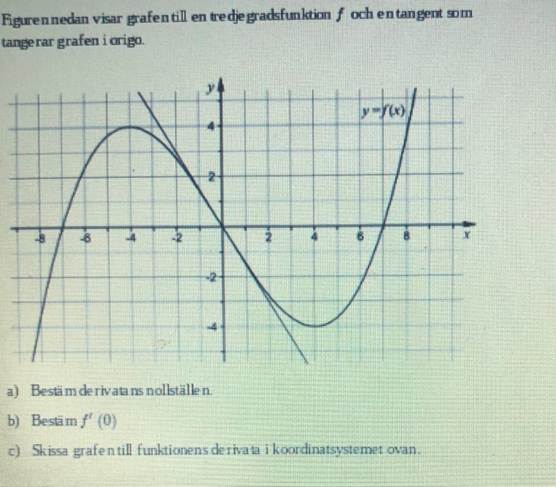 Notera att det då blir en skiss av f(x), men det är helt onödigt eftersom du redan fått f(x) givet i problemet. Det är f’(x) du skall skissa. Du kan göra en värdetabell för f’(x) - du har redan tre värden. Du kan ta fram fler värden genom att dra tangenter och uppskatta lutningen eller genom att göra en ansats för hur f’(x) ser ut som jag tipsade om tidigare.