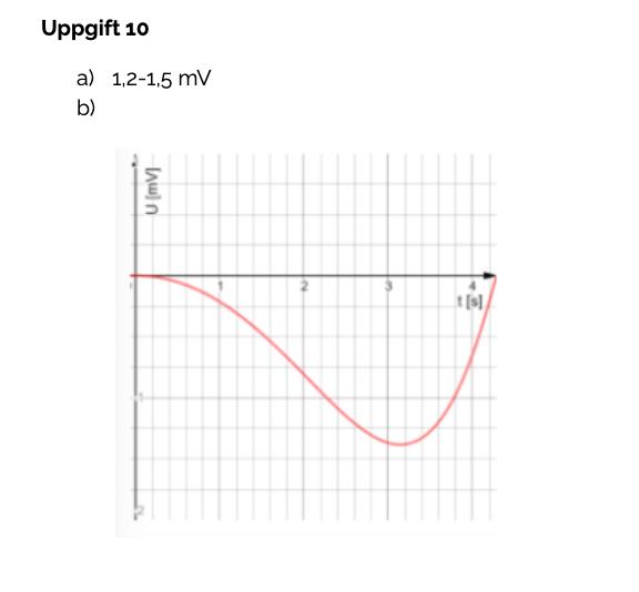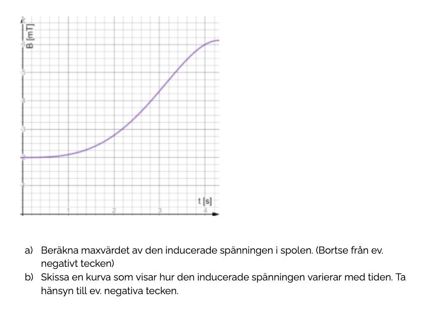 På a) tänkte jag att den inducerade spänningen e=tidsderivatan av flödet, som i sin tur beror av flödestätheten och arean. Jag tänkte att när grafen för flödestätheten (bilden ovan) har brantast lutning, har också tidsderivatan av flödet störst värde eftersom arean är oförändrad. Det verkade bli rätt.