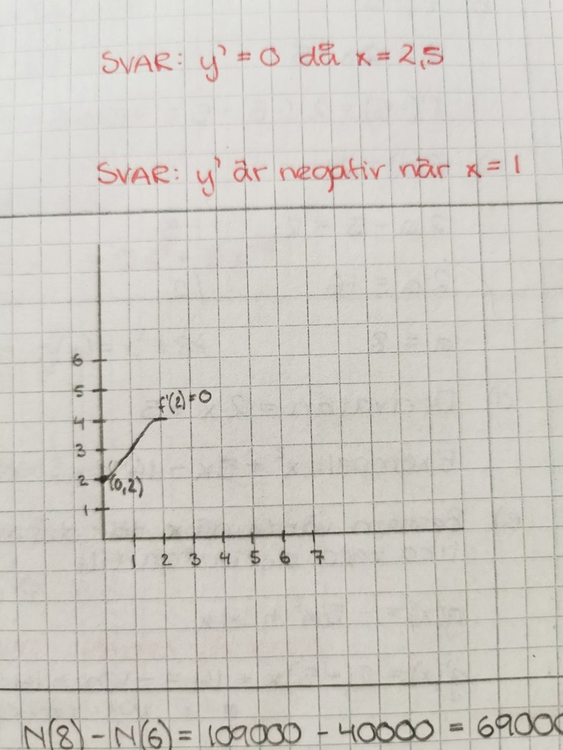 Du har ju punkten (0, 2) och vet att lutningen är 1 i den punkten. Sedan får vi veta att lutningen är noll i x = 2