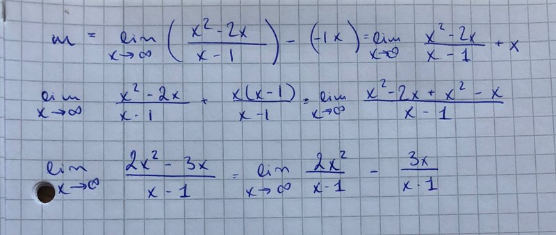 Jag ska skissa grafen till f(x)=x2-2xx-1och behöver alltså anv asymptoter för detta. Fick fram korrekt vertikal asymptot, dvs x=1, men fastnar på den sneda. Tänkte såhär: