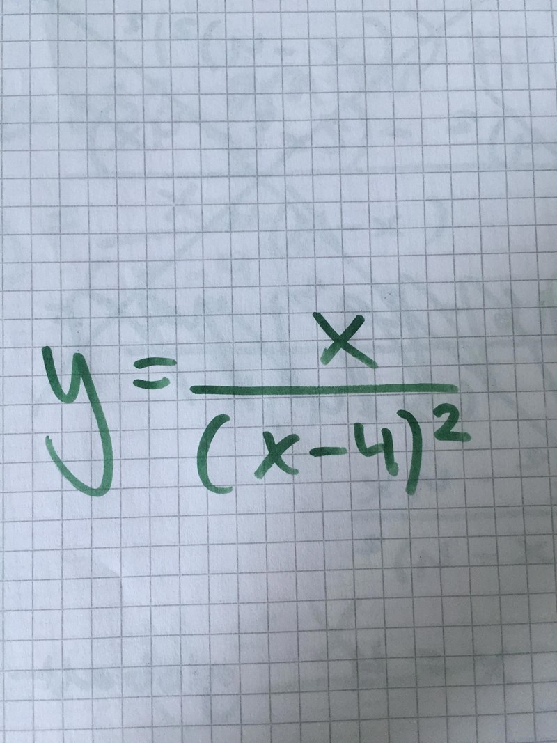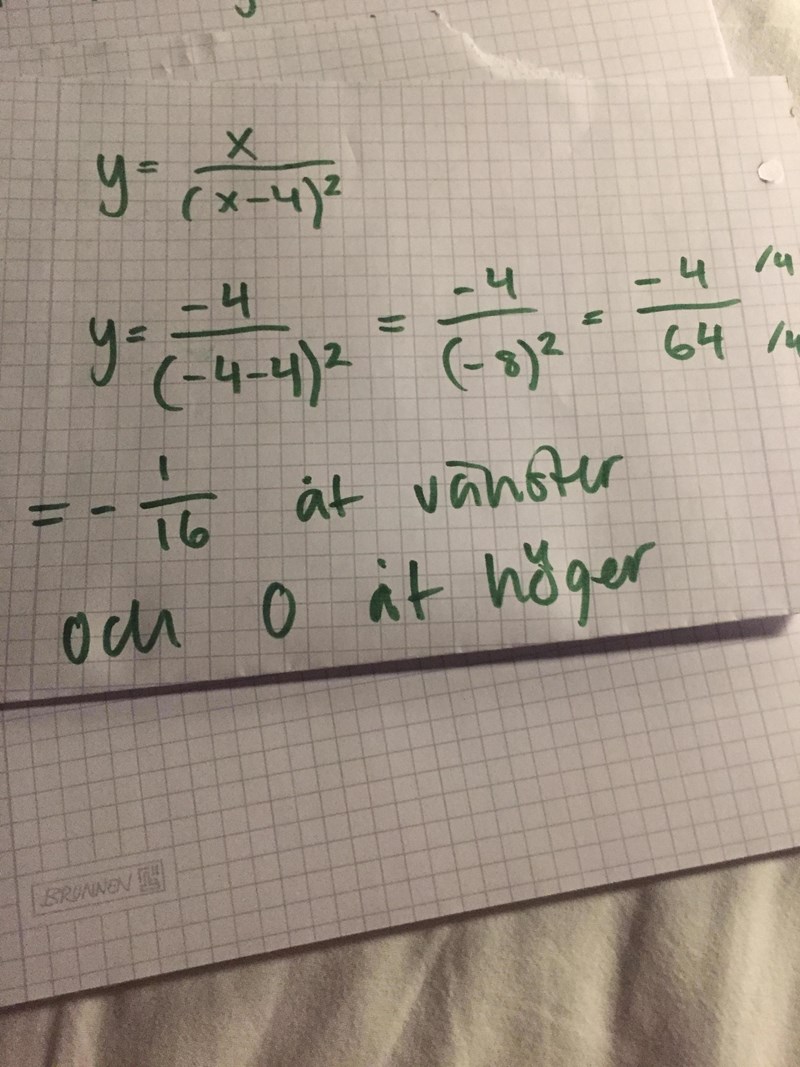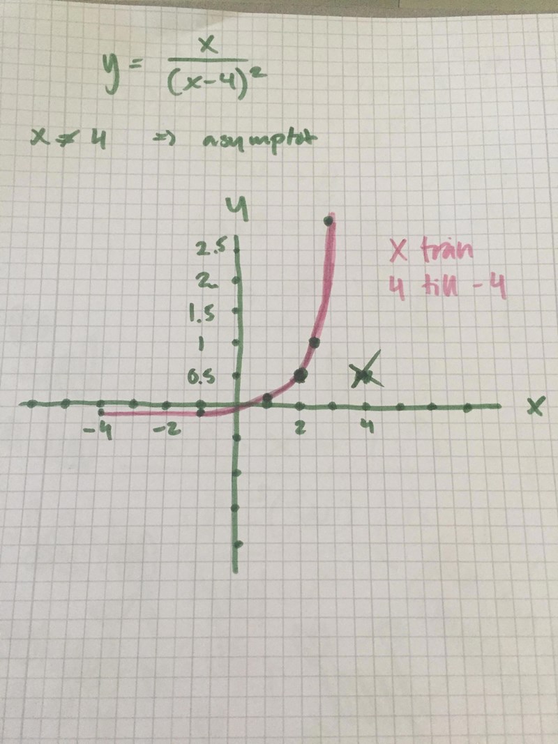 Det stämmer att du har en lodrät asymptot vid x = 4. Hur ser det ut när man närmar sig x = 4 från höger? Från vänster?