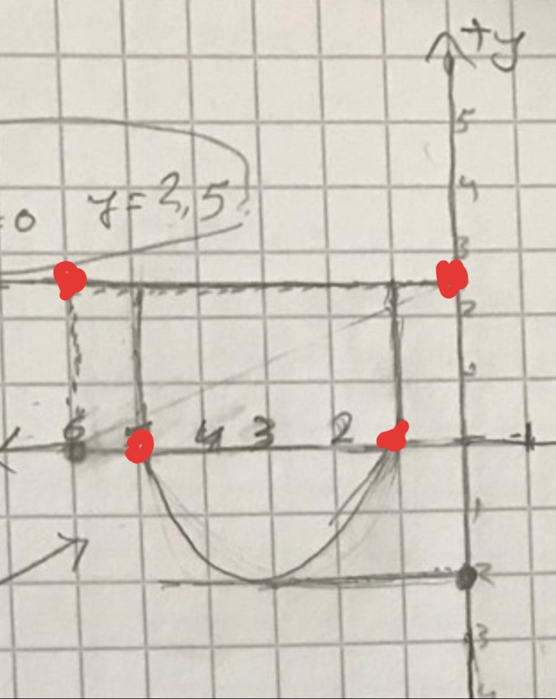 Bra början! Nollställena och minimipunkten är rätt inprickade. Det är bara skärningen med y = 2,5 som är otydlig.