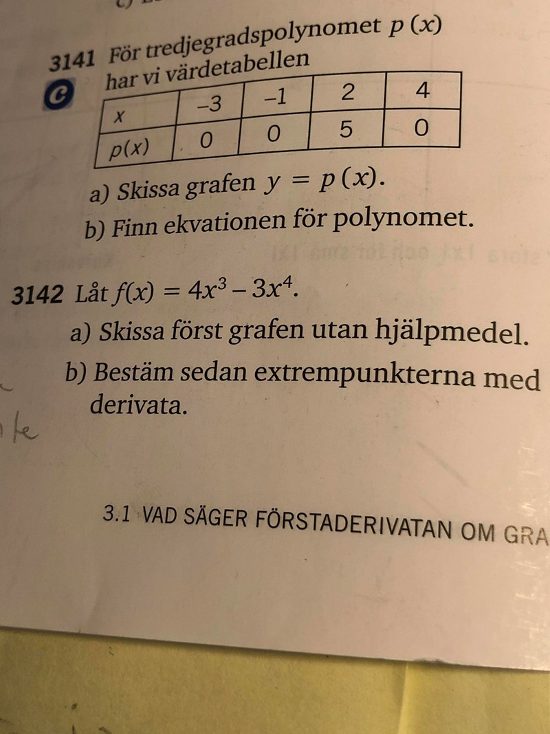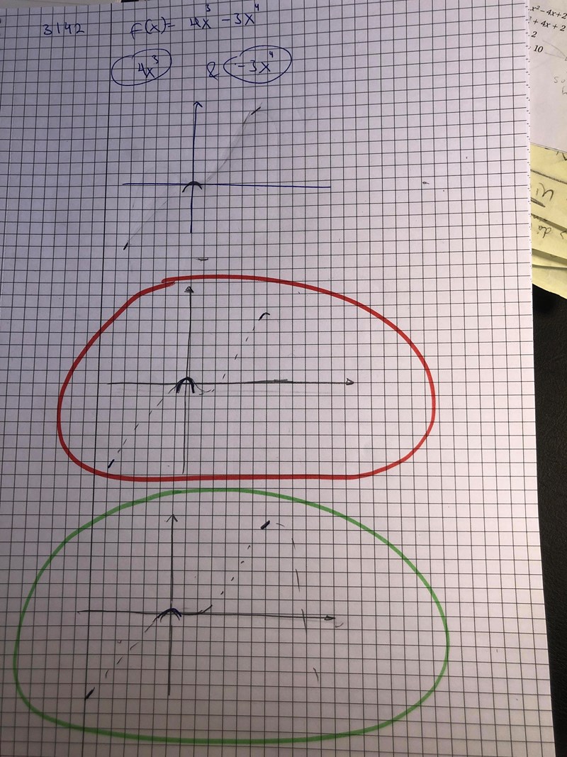 På 3142 så är det rätta svaret på a) det som är grönmarkerat. Men varför är det röda fel? Det jag har gjort tills jag kommit till denna uppgift är att jag markerat ut hur grafen ser ut i två delar dvs jag delar upp funktionen där i detta fallet är den ledsna munnen (-3x upphöjt till 4) och tredjegradsfunktionen är de två sträcken från vänster sida till höger. Jag ska ju sen sammanföra dessa sträck, där jag drar från där fästa sträcker går till slutet dvs (den som har ligger högst upp (vid y-värdet). Varför gör de i facit så att de drar ner efter den högsta funktion?