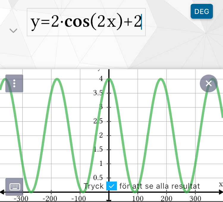 Dr.scofield skrev:Hej! Varför är denna grafskiss till funktionen y=2cos2x+2 fel? Enligt facit behöver den även vara förskjuten åt vänster så att den skär y-axeln vid y = 4. Men detta anges inte i funktionsuttrycket. Tack på förhand!