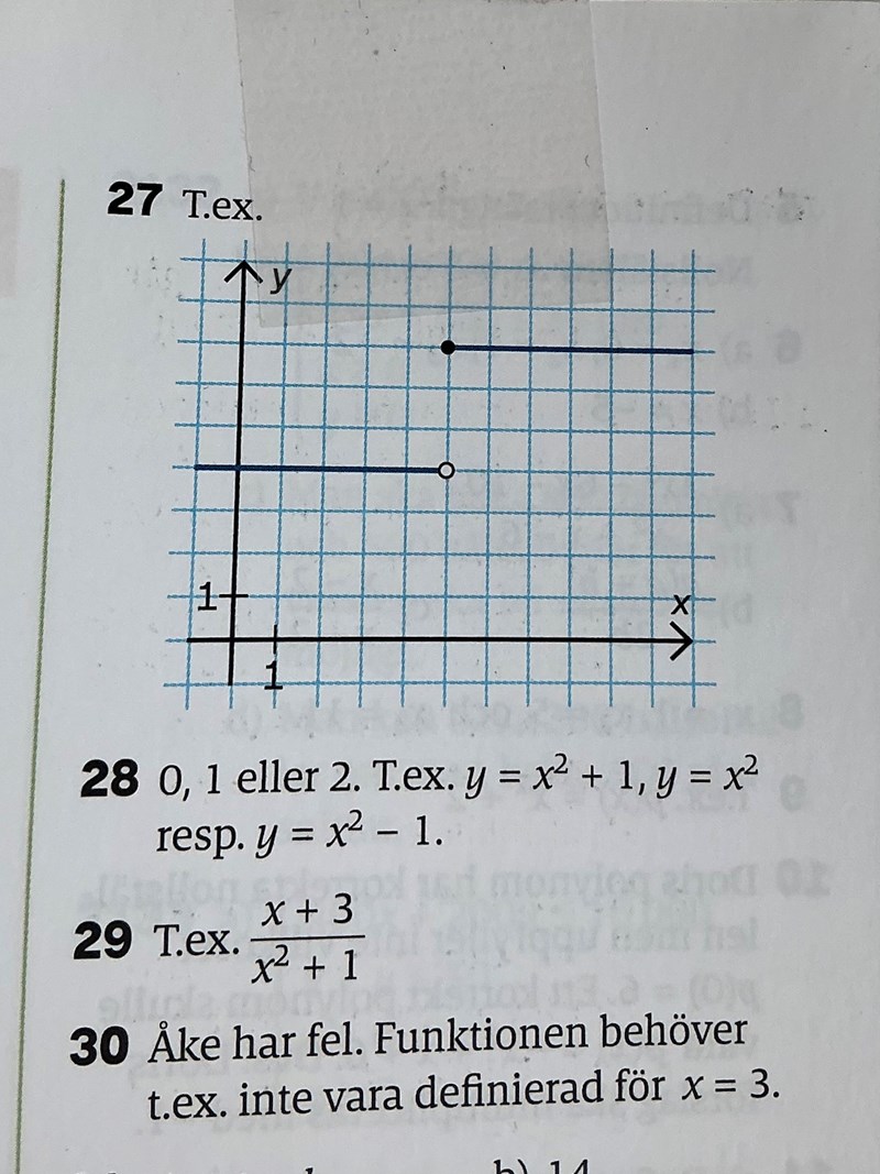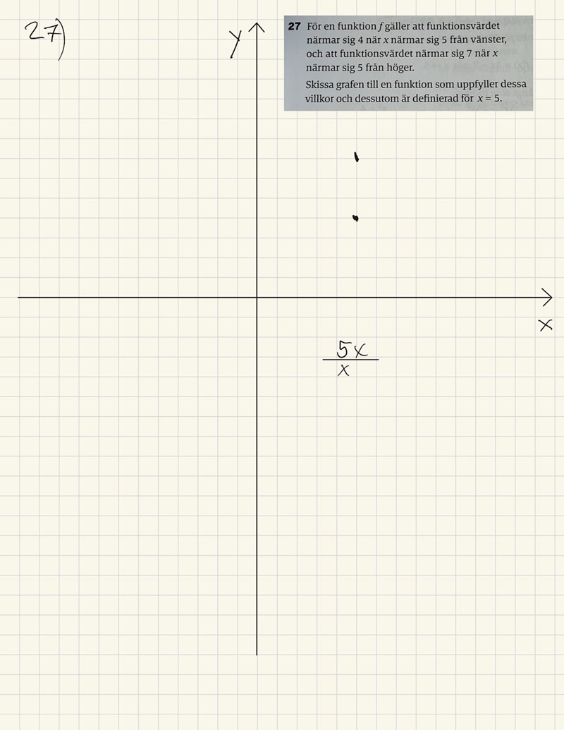 Skissa grafen till en funktion som uppfyller dessa villkor och dessutom är def. för x=5