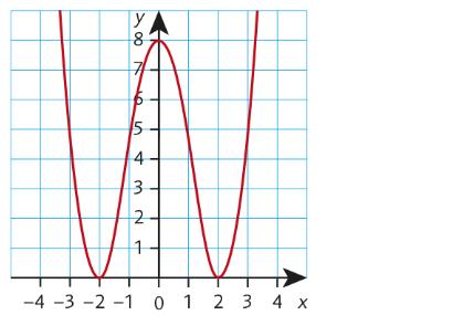 Grafen är ett tredjegradspolynom som har två lokal minimipunkt i (-2 , 0), (2 , 0) och en lokal maximipunkt i (0 , 8).