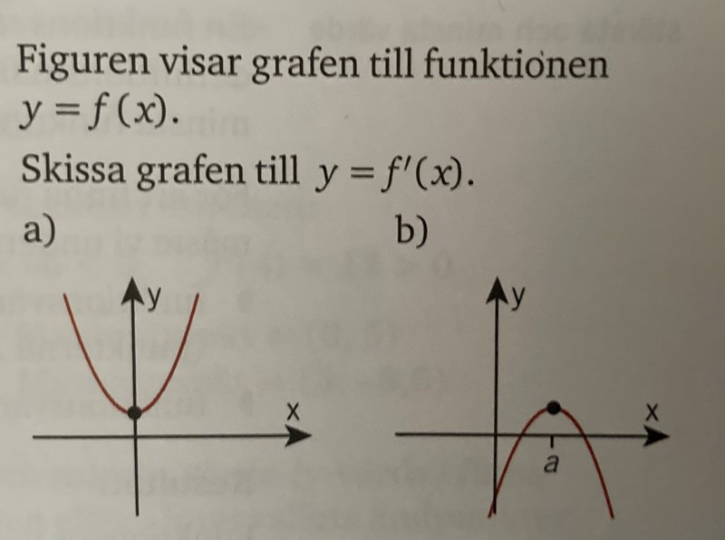 Dock "omöjlig" uppgift då man inte vet vad det är för typ av funktion som är ritad, men du ska nog anta att det är andragradspolynom (andragradsfunktioner), vilket innebär att derivatorna är räta linjer.