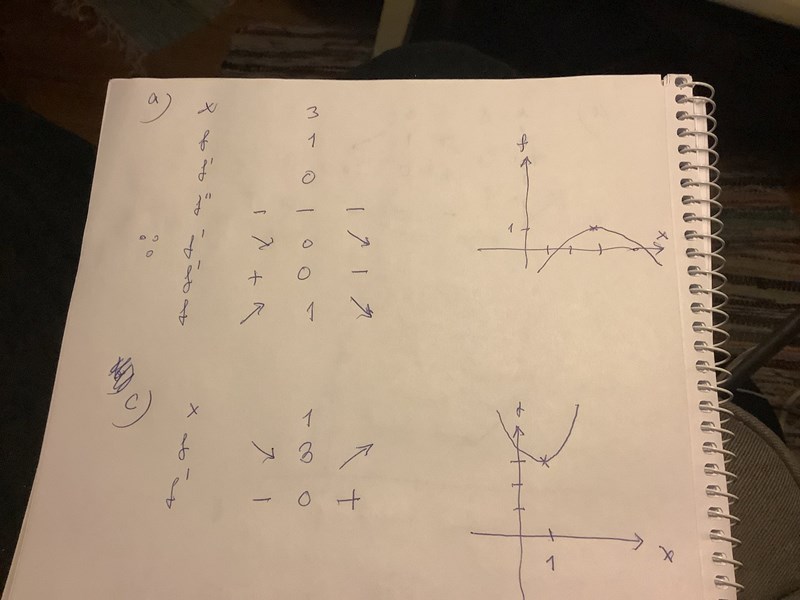 Hejhej! Jag har skissat fel för alla grafer i denna uppgift, och vet inte riktigt hur jag ska tänka rätt här. Hade någon kunnat hjälpa är ni snälla? All given information om f, f' och f'' ska på något sätt hjälpa mig veta hur grafen ska se ut. Jag vet däremot inte riktigt hur jag ska hantera denna info för att komma fram till rätt skiss.