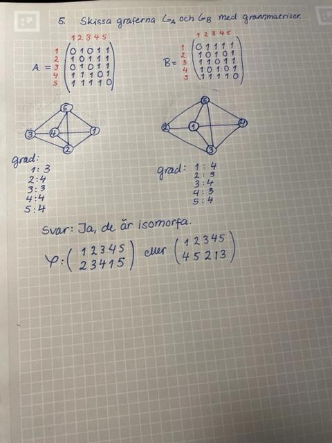 Dels kan två icke-isomorfa grafer ha samma grader på sina noder: ett enkelt exempelt är en cykelgraf med 6 noder och en graf som består av tre cykler med 3 noder. Båda graferna har 6 noder och alla noder i båda graferna har gradtal 2. Men det finns också exempel på isomorfa grafer säg G och H där det i både G och H finns två noder u i G och v i H med samma gradtal men där ingen isomorfi mellan G och H avbildar u på v. Försök att konstruera ett sådant exempel, det är inte jättesvårt.