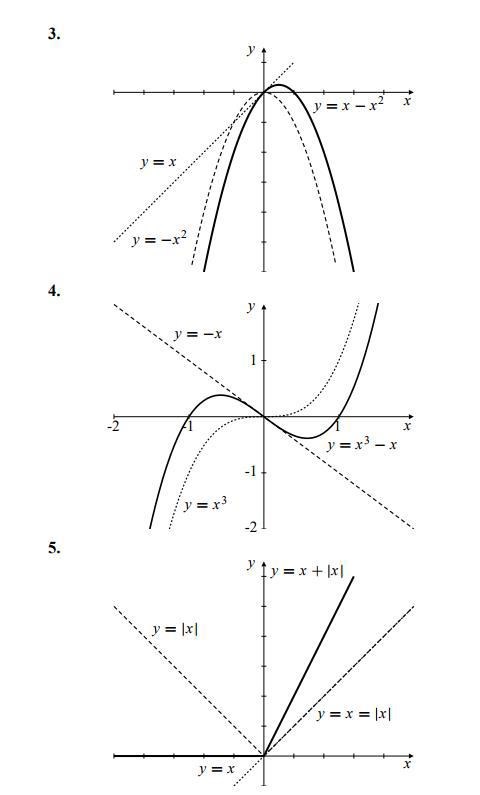 På uppgift 4, exempelvis, har du en streckad linje som är y=-x y = -x och en prickad linje som är y=x3 y = x^3 . Du vill få fram den heldragna linjen y=x3-x y = x^3 - x , d v s streckad linje plus prickad linje.