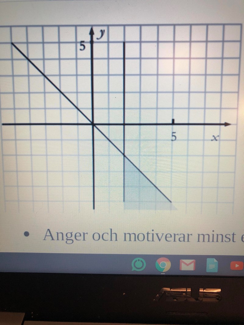 Lös ut y ur sambandet x+y=0 och rita upp linjen. Markera var på bilden du har x+y>0 och x>2. Undersök var båda påståendena stämmer samtidigt.