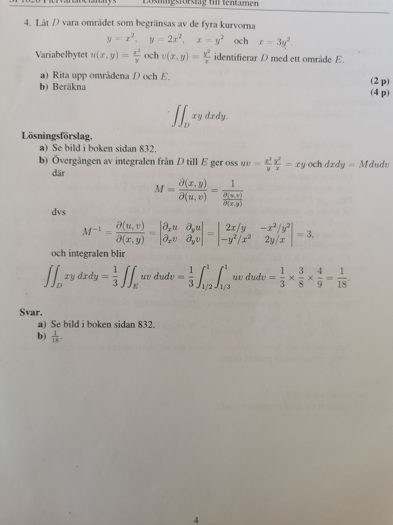 Jag har fastnat på fråga b) där man ska ta fram gränser för u och v. Men jag förstår inte hur de hamnar där då facit inte säger så mycket.